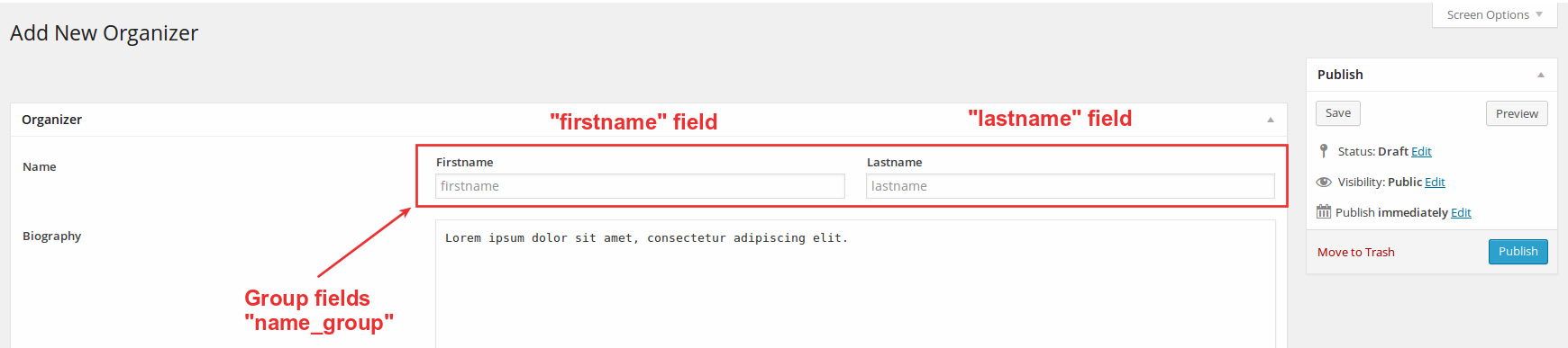 function set_cpt_organizer_title($data, $post_array) { if ($post_array['post_type'] == 'organizer') { if((isset($post_array['_post_meta']['firstname'][0])) || isset($post_array['_post_meta']['lastname'][0])) { $full_name = $post_array['_post_meta']['firstname'][0] . ' ' . $post_array['_post_meta']['lastname'][0]; return $full_name; } else { return $post_array['post_title']; } } else { return $post_array['post_title']; } } add_filter('piklist_empty_post_title', 'set_cpt_organizer_title', 10, 2);3) The WordPress
