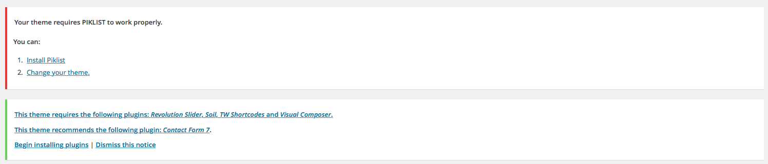 Here is a picture of the code: http://i.imgur.com/VP1tl4E.pngIm not sure which is at fault, but I assume it is piklist because it the link is to the themes page where as TGMPA would link to plugins or it’s install mechanism.