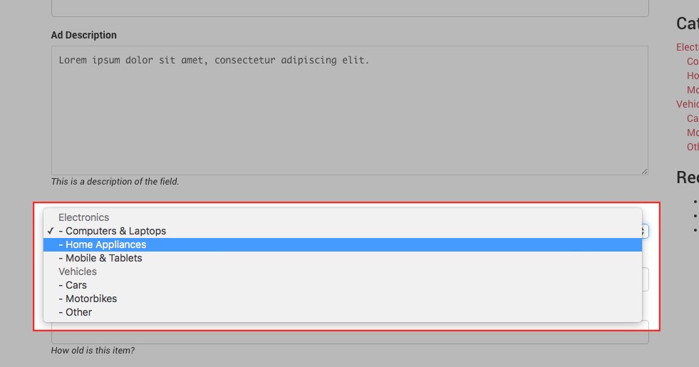 <div class="form-group piklist-theme-field-container"> <div class="piklist-theme-label"> <label for="_post_meta[category]" class="piklist-field-part piklist-label piklist-label-position-before ">Category</label> </div> <select id="_post_meta_category_0" name="_post_meta[category]" class="ad-category form-control _post_meta_category piklist-field-element"> <?php foreach ($parents as $parent => $value) { echo '<option disabled="disabled" value="0">'.$value->name.'</option>'; $terms = get_terms( 'classifieds_categories', array( 'hide_empty' => false, 'parent' => $value->term_id ) ); foreach ($terms as $term) { echo '<option value="'.$term->term_id.'"> - '.$term->name.'</option>'; } } ?> </select> </div>With a “save_post” hook I then used the temporary stored category meta value to set the taxonomy terms